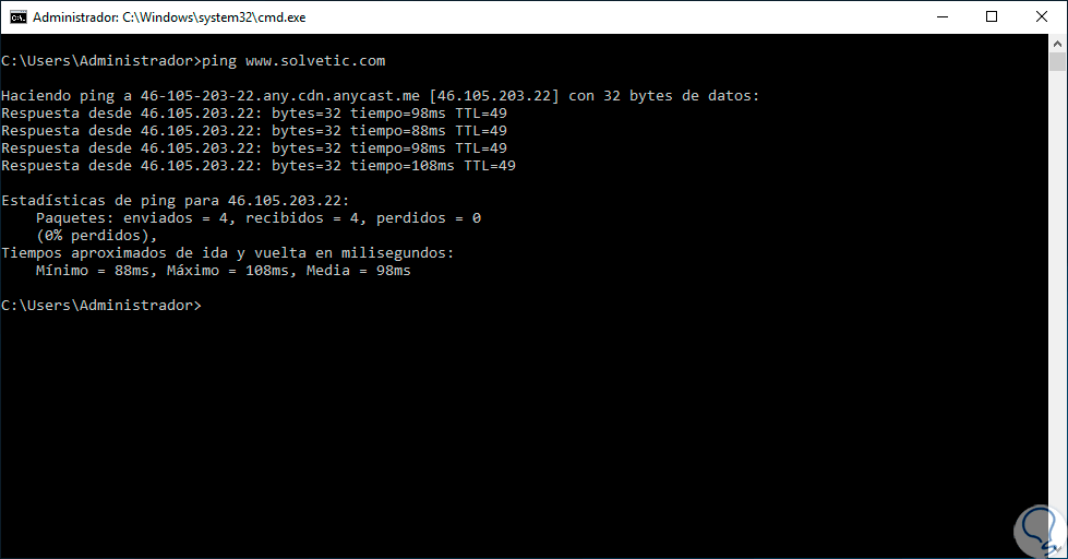Con esta regla habilitada podemos acceder al símbolo del sistema y desde allí hacer ping ya sea a una dirección IP o a un nombre de dominio para analizar sus detalles: