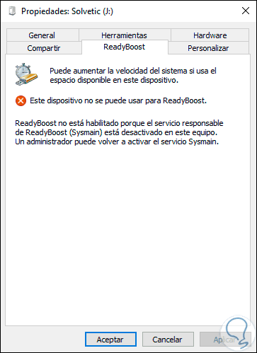 Un término que quizás escuchas es ReadyBoost, ¿verdad?, bueno, ReadyBoost es una función de software que una vez activa en un dispositivo de almacenamiento (discos, USB). Permite almacenar archivos de aplicaciones y datos con el fin de liberar la memoria RAM física del equipo y con ello mejorar la velocidad general, pero adivina que, ¿sabes?, SysMain es el encargado de gestionar ReadyBoost, por ello, si este servicio está deshabilitado veremos lo siguiente al acceder a las propiedades del medio de almacenamiento en la pestaña ReadyBoost: