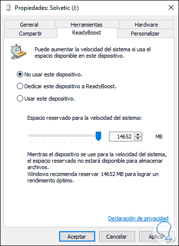 Ahora que el servicio SysMain ha sido habilitado de forma correcta en Windows 10 podemos ir de nuevo a las propiedades del dispositivo de almacenamiento y en la sección ReadyBoost validar que se activan las opciones de dicha función: