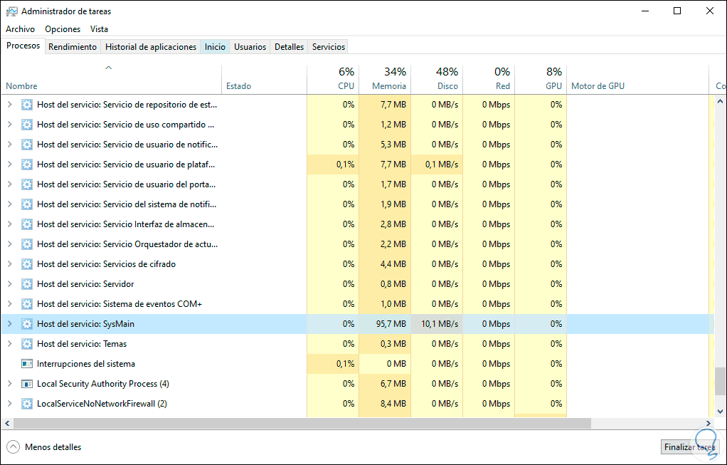 SysMain se ejecuta en segundo plano en Windows 10 y esto lo podemos comprobar desde el Administrador de tareas en la pestaña Procesos en la sección “Procesos de Windows”: