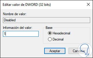 Damos doble clic sobre este valor y en el campo “Información del valor” ingresamos el número uno (1). Pulsamos en Aceptar para guardar los cambios y podemos salir del editor.
