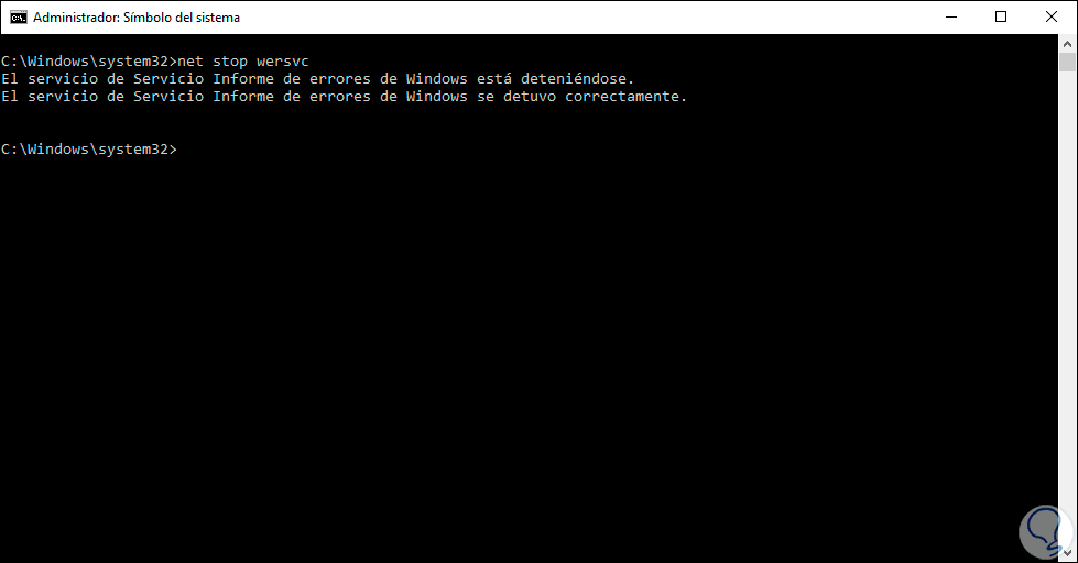 Este es un método que permite detener el servicio de Informe de errores asociado el cual es el servicio “wersvc”, para esto, accedemos como administradores a la consola del símbolo del sistema y ejecutamos lo siguiente: