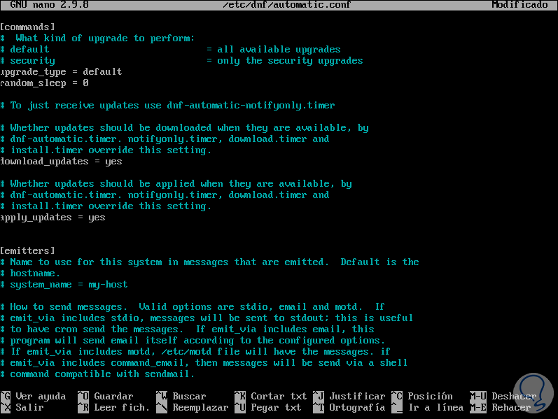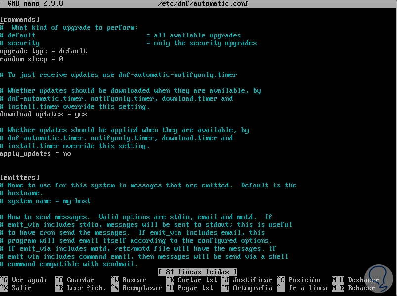 Ahora vamos a configurar las actualizaciones automáticas usando este paquete RPM, para ello debemos acceder al archivo de configuración ubicado en la ruta /etc/dnf/automatic.conf, accederemos con algún editor de texto para su edición:
