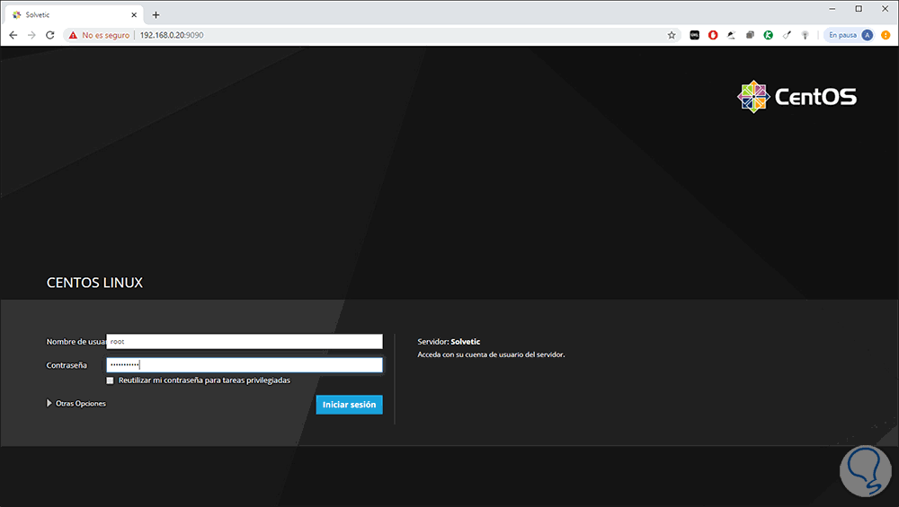 https://IP_Servidor:9090Tras esto ingresaremos las credenciales de usuario root: