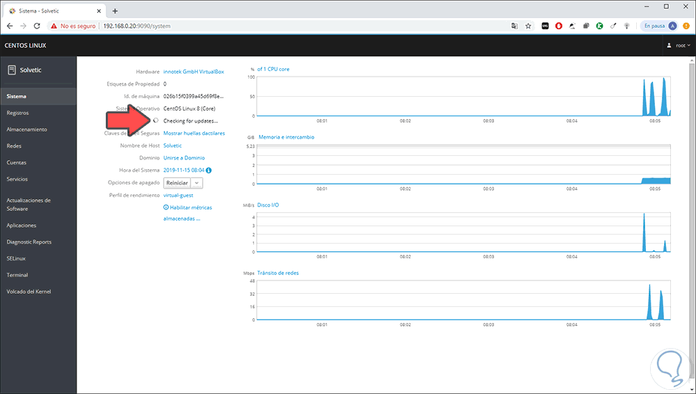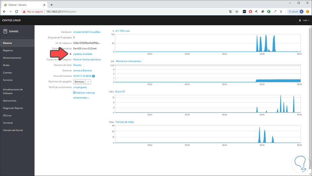 CentOS 8 integra Cockpit la cual es una consola de administración web la cual nos permite realizar diversas operaciones de gestión y administración del sistema operativo, para su instalación puedes visitar el siguiente enlace de Solvetic: