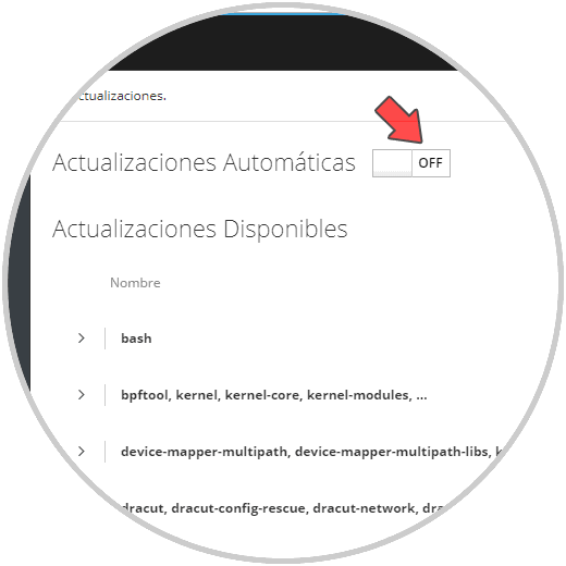 Finalmente, desde la misma consola será posible deshabilitar las actualizaciones automáticas en CentOS 8. Para ello accedemos a la consola y desde la sección “Actualizaciones de software” basta con pulsar en el interruptor “Actualizaciones automáticas” para que su estado pase a ser Off: