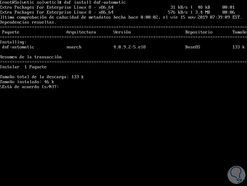 Ingresamos la letra “s” para confirmar la descarga del paquete RPM: