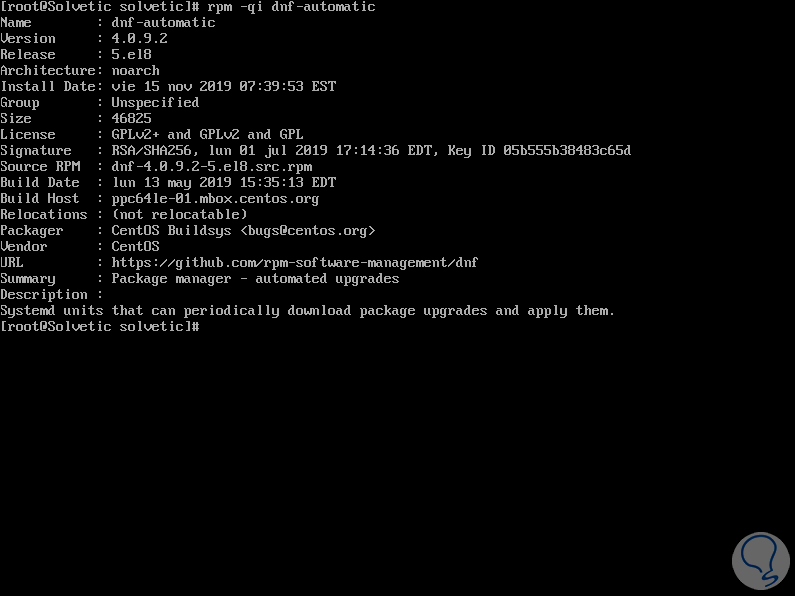 Para acceder a detalles más completos del paquete RPM DNF-automatic podemos ejecutar lo siguiente: