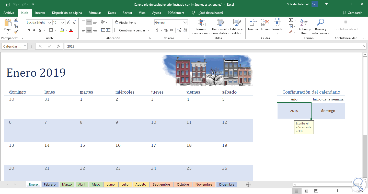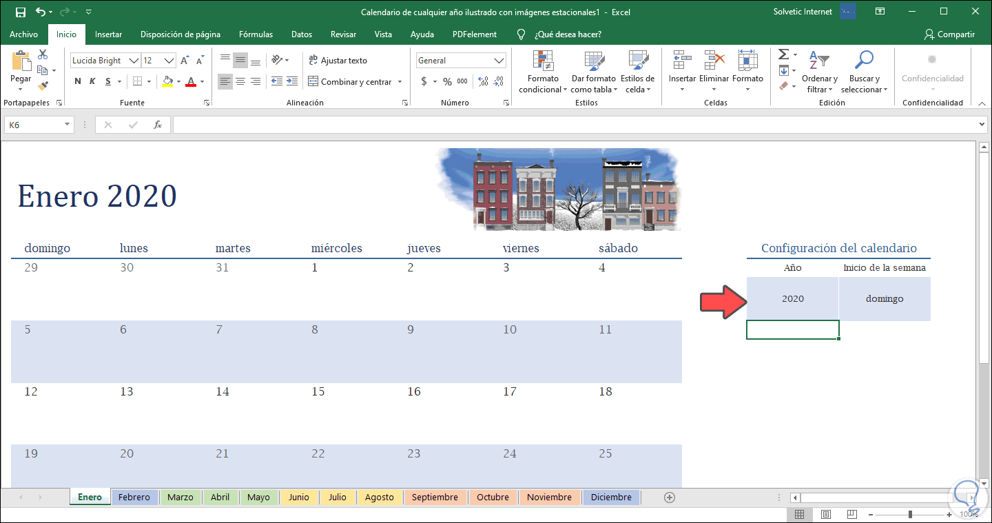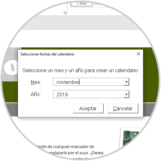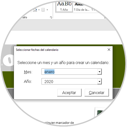En este caso esta plantilla asigna automáticamente el nuevo año 2020 pero en otras plantillas se desplegará una ventana emergente donde será posible asignar mes y año:
