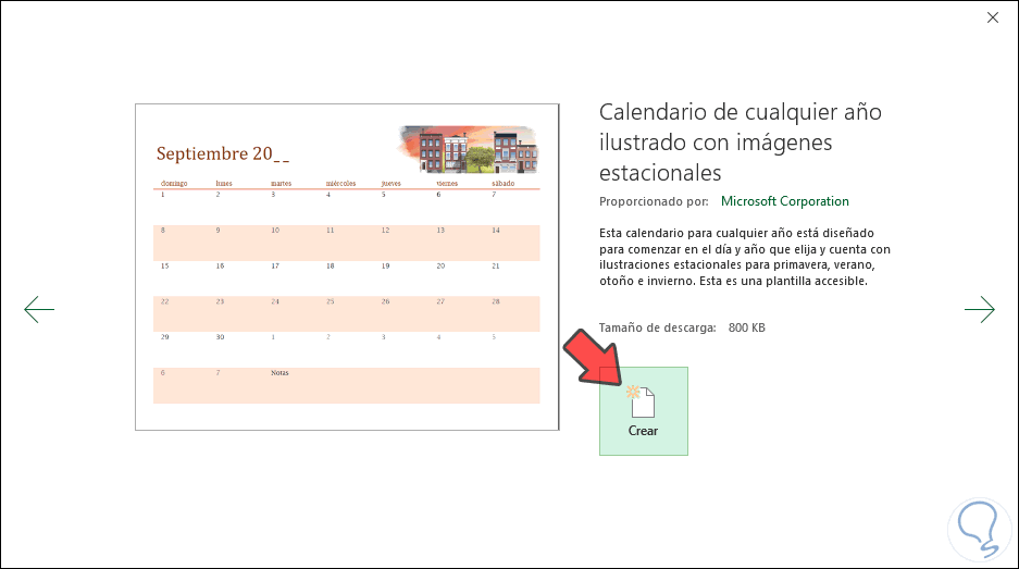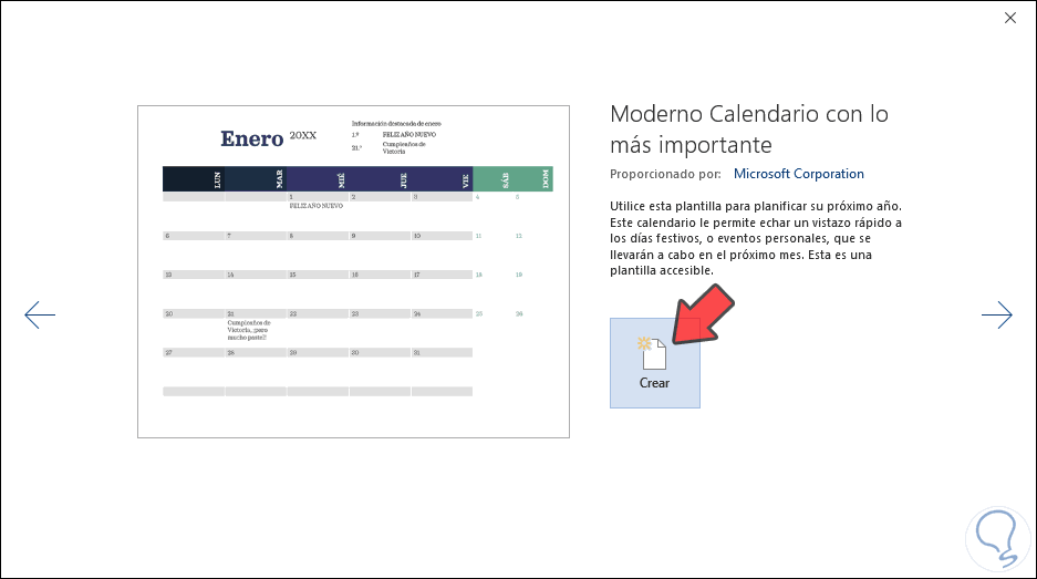 Seleccionamos la plantilla de calendario deseada y al hacer esto se desplegará lo siguiente. Damos clic en el botón Crear para dar inicio al proceso de creación del respectivo calendario.
