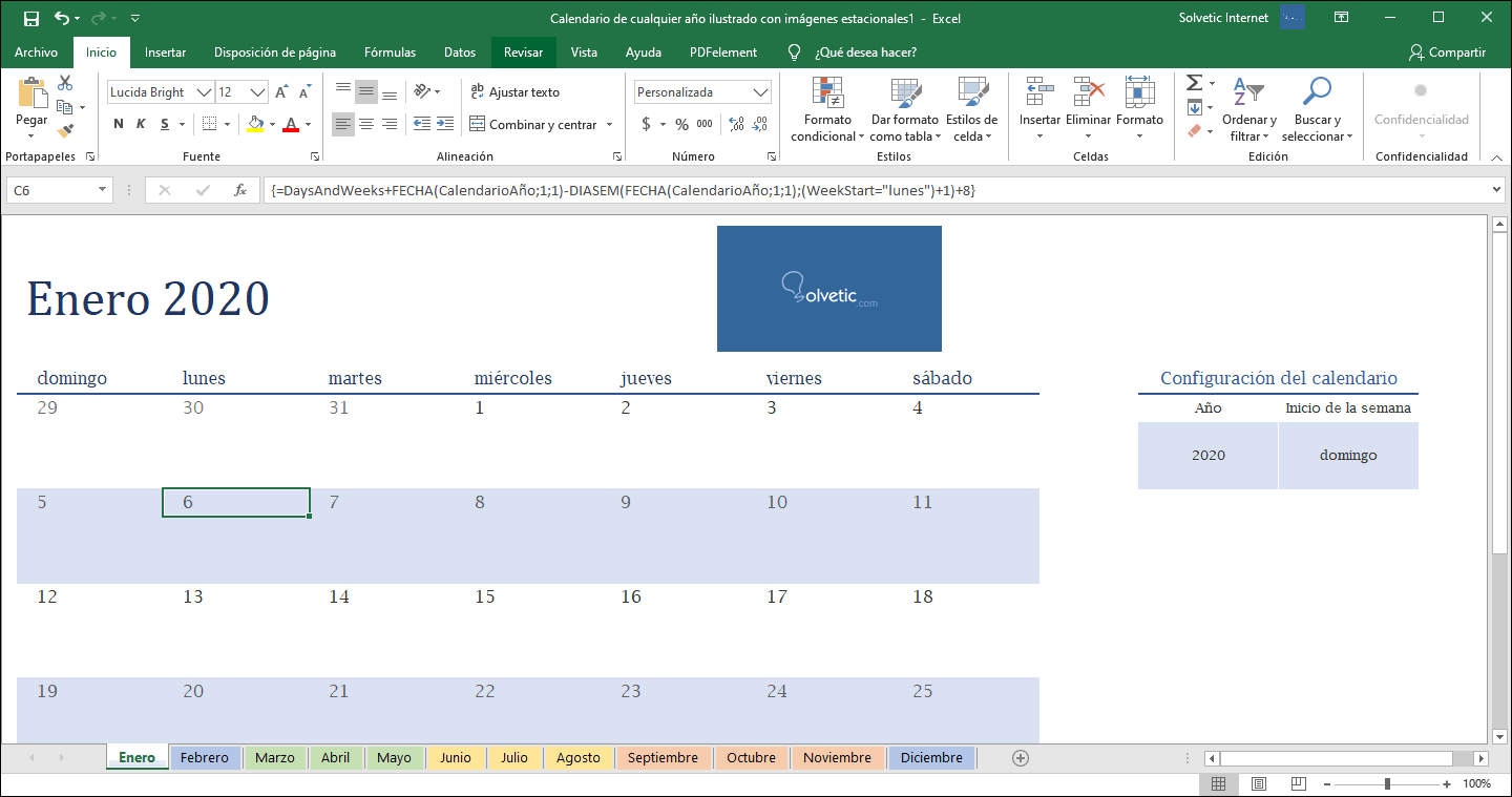 En este caso el calendario se ha diseñado con el fin de que al momento de ingresar el año en el campo Año automáticamente se hagan los ajustes en el mismo de forma global, ingresamos el año 2020 y sucede esto:
