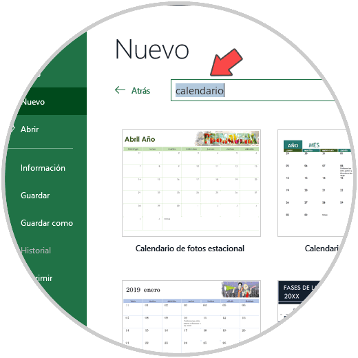 El proceso en Excel es idéntico que Word ya que debemos ir al menú Archivo / Nuevo y luego ingresar “calendario” en el cuadro de búsqueda para desplegar las plantillas integradas: