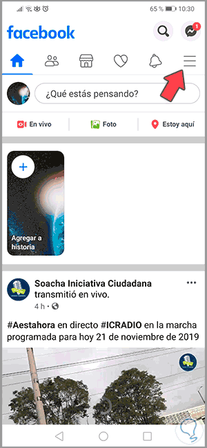 Para hacer esto, accedemos a la aplicación de Facebook en Android donde veremos lo siguiente. Allí pulsamos sobre el ícono de configuración (3 líneas horizontales) en la parte superior derecha