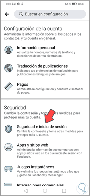 Al seleccionar esta línea se desplegarán diversas opciones donde debemos elegir la línea “Seguridad e inicio de sesión”: