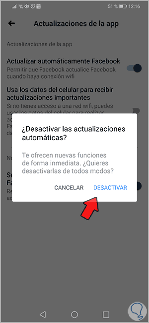 Para desactivarlas, pulsamos en el interruptor “Actualizar automáticamente Facebook” y se lanzará el siguiente mensaje: