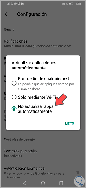 En las opciones desplegadas dispondremos de lo siguiente. En este caso seleccionamos “No actualizar apps automáticamente” pero como mencionamos esto afectará a todas las aplicaciones de Android.