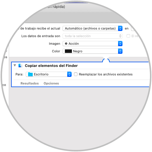 Se desplegará la siguiente ventana y en el panel lateral izquierda seleccionamos la línea “Copiar elementos del Finder”: