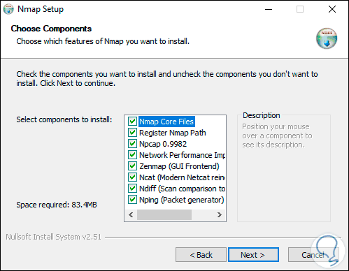 Una vez descarguemos el ejecutable de Nmap debemos instalarlo de forma local en Windows 10 seleccionando que herramientas estarán disponibles: