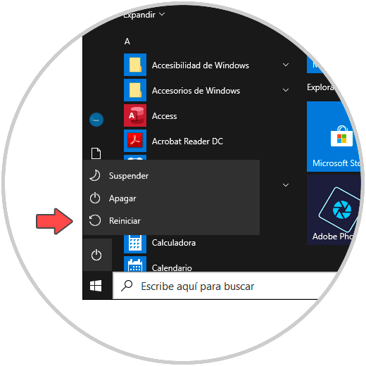 Si el error es persistente, podemos ejecutar un reinicio del sistema para que todos los servicios sean actualizados, para ello pulsamos en el menú Inicio y allí seleccionamos Reiniciar desde la opción de apagado:
