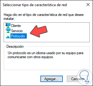 Damos clic en el botón Instalar y en la siguiente ventana seleccionamos “Protocolo”: