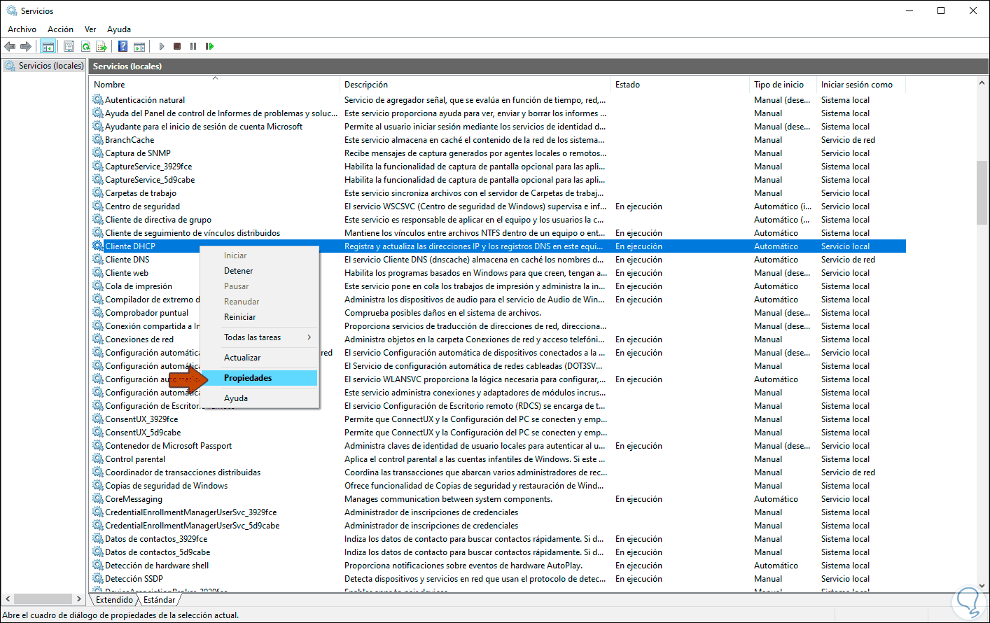 Pulsamos Enter o Aceptar y en la ventana desplegada ubicaremos el servicio llamado “Cliente DHCP”, damos doble clic sobre el o bien clic derecho / Propiedades: