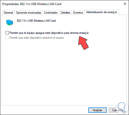 Después de esto iremos a la pestaña “Administración de energía” y allí desactivamos la casilla “Permitir que el equipo apague este dispositivo para ahorrar energía”. Pulsamos en Aceptar para guardar los cambios.
