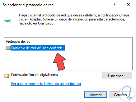Damos clic en Agregar y ahora seleccionamos “Protocolo de multidifusión confiable”. Damos clic en Aceptar para guardar los cambios.