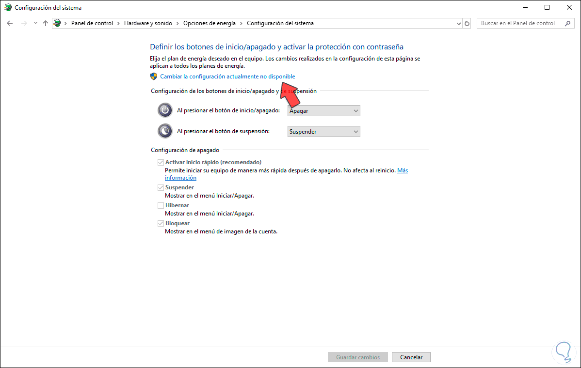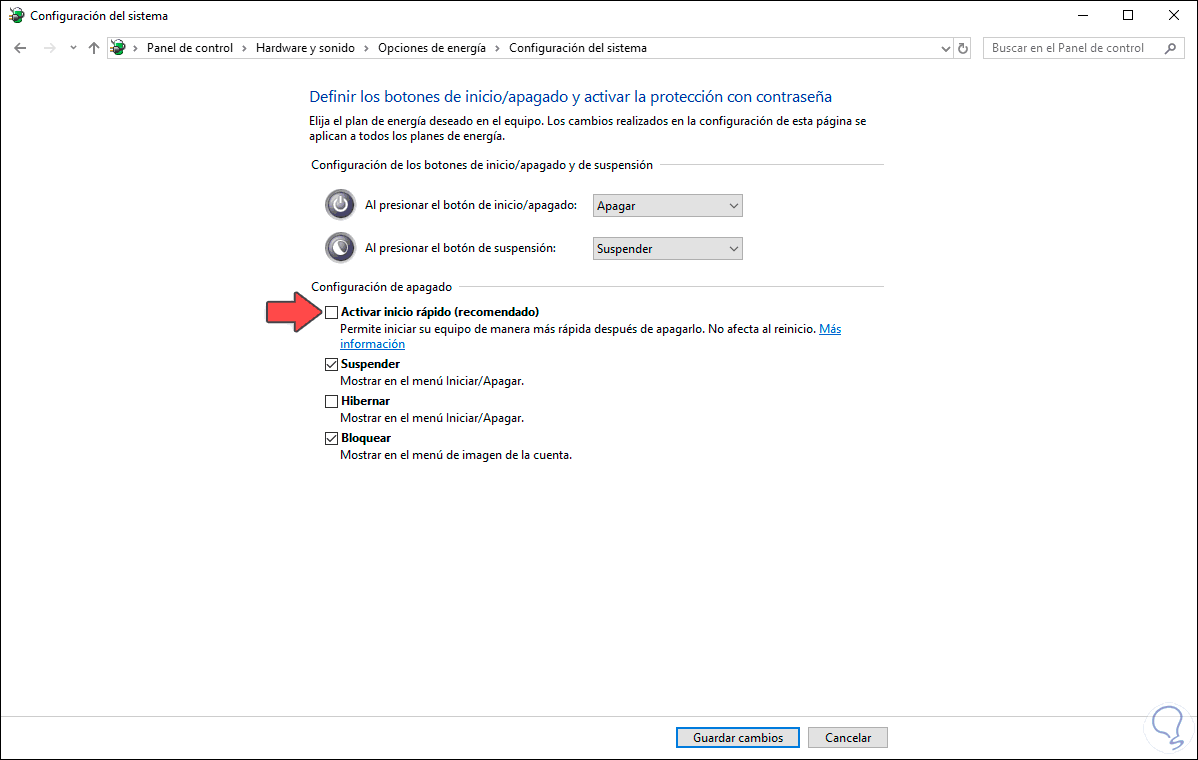 Damos clic en la línea “Cambiar la configuración actualmente no disponible” y luego desactivamos la casilla “Activar inicio rápido”. Damos clic en Guardar cambios para completar el proceso y reiniciar el equipo.