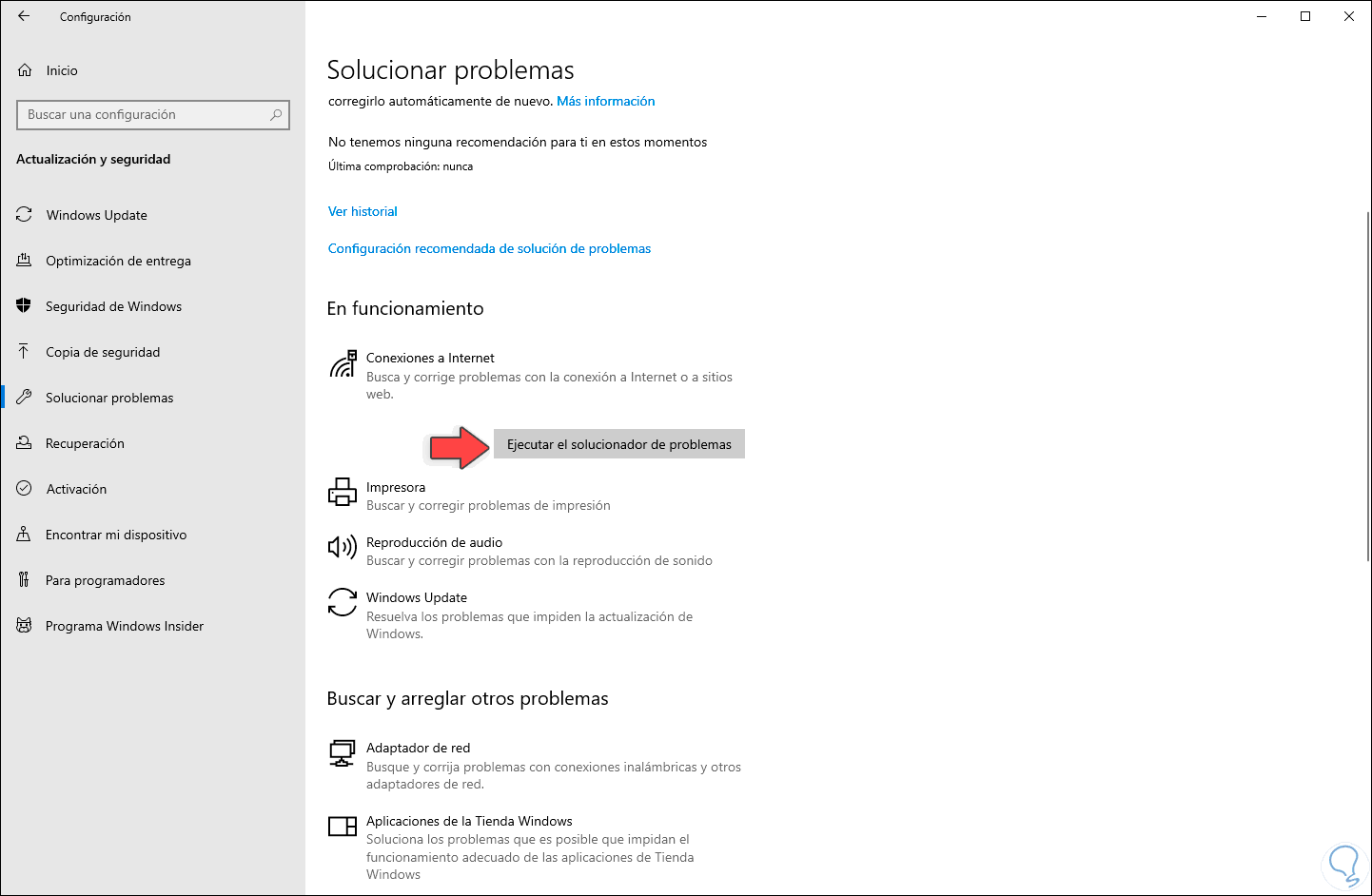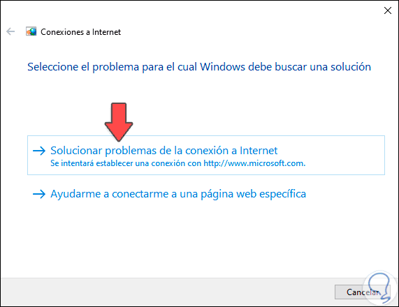 Allí debemos ubicar la opción “Conexiones a Internet”, damos clic sobre ella y se activará el botón “Ejecutar el solucionador de problemas”;