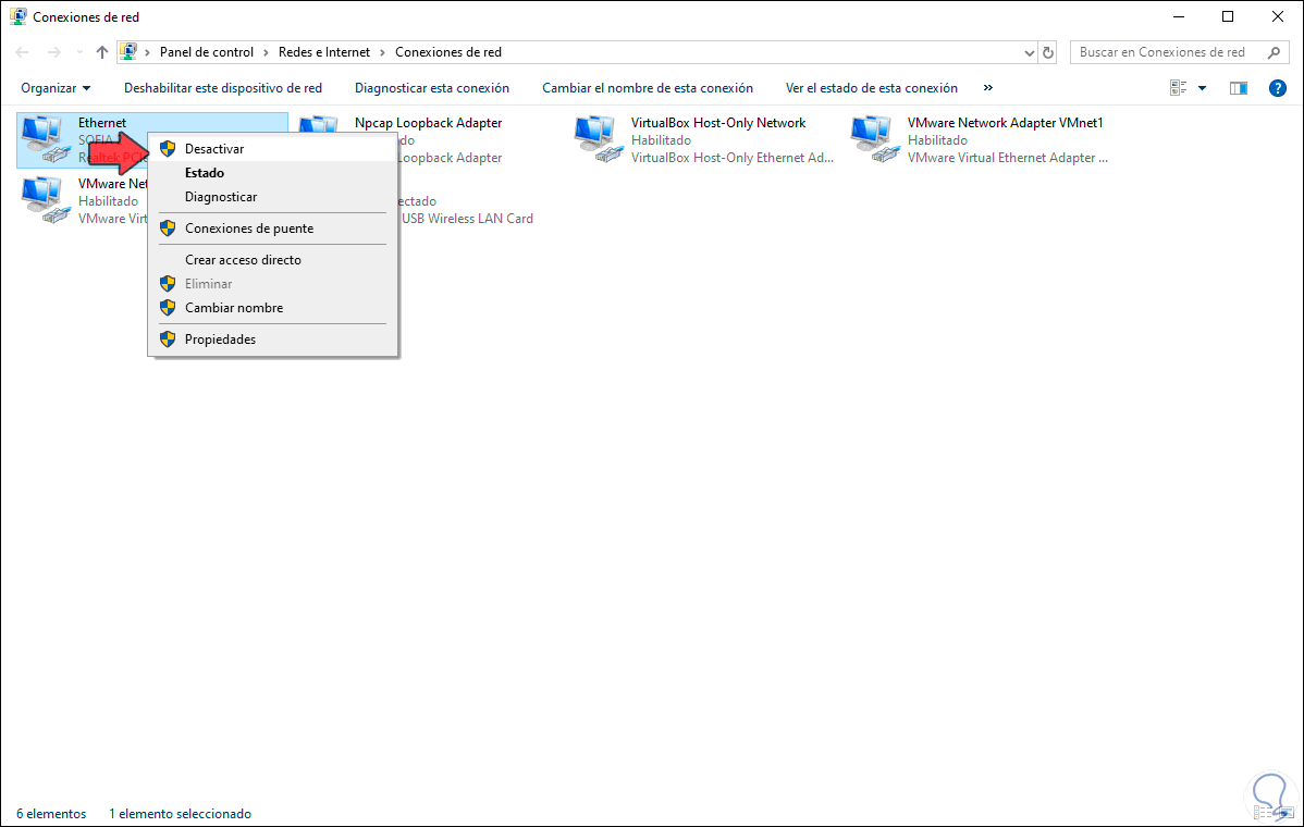 Para ello vamos al centro de redes y recursos compartidos, damos clic derecho sobre nuestro adaptador y seleccionamos “Desactivar”: