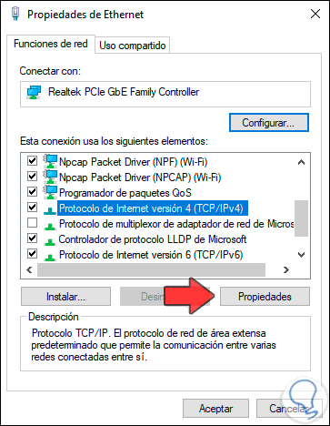 En la ventana desplegada ubicamos la línea “Protocolo de Internet versión 4”: