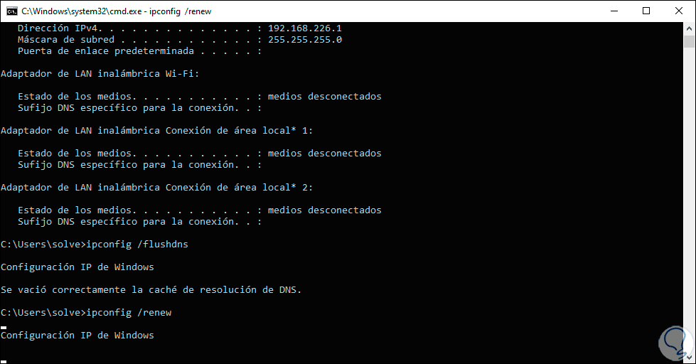 Este es un proceso que implica renovar la IP del equipo a través del símbolo del sistema, para ello accedemos a la terminal y ejecutamos los siguientes comandos: