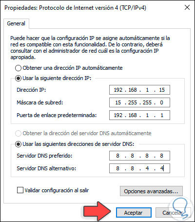 Damos clic en Propiedades y en la ventana desplegada activamos la casilla “Usar la siguiente dirección IP” e ingresamos lo siguiente. En la sección DNS hemos usado los DNS de Google. Pulsamos en Aceptar para guardar los cambios.