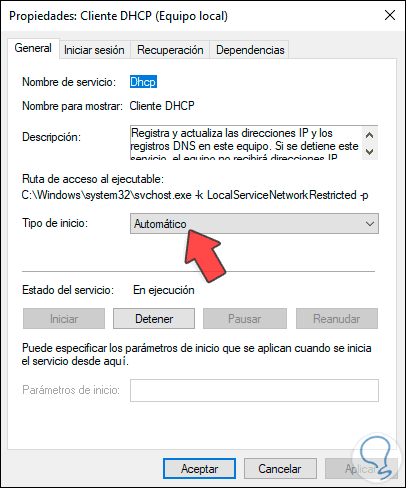 En la ventana que será desplegada definimos en el campo “Tipo de inicio” la opción “Automático”: