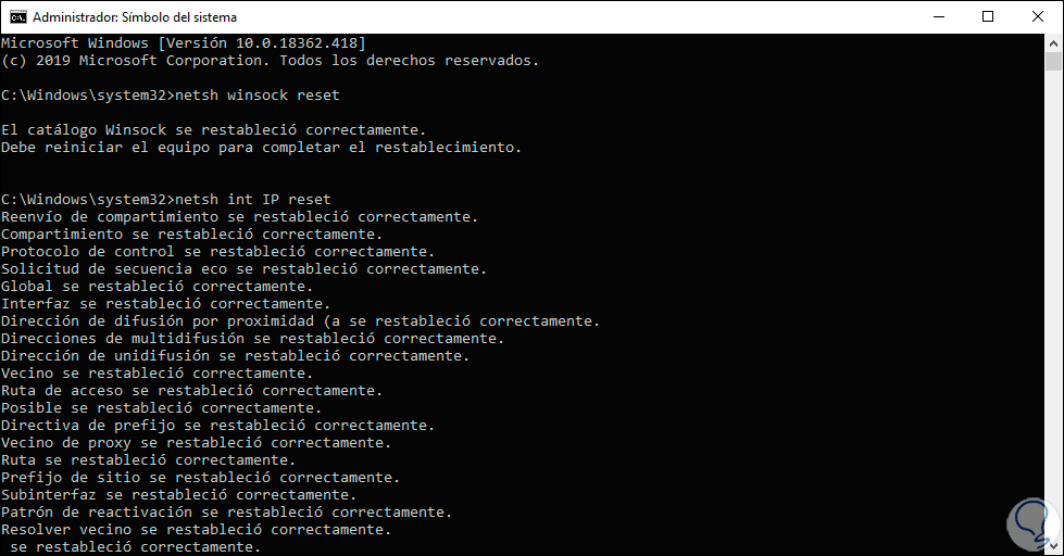 Otro paso a dar será intentar renovar los sockets de red desde la terminal, para ello accedemos como administradores al símbolo del sistema y allí ejecutar lo siguiente: