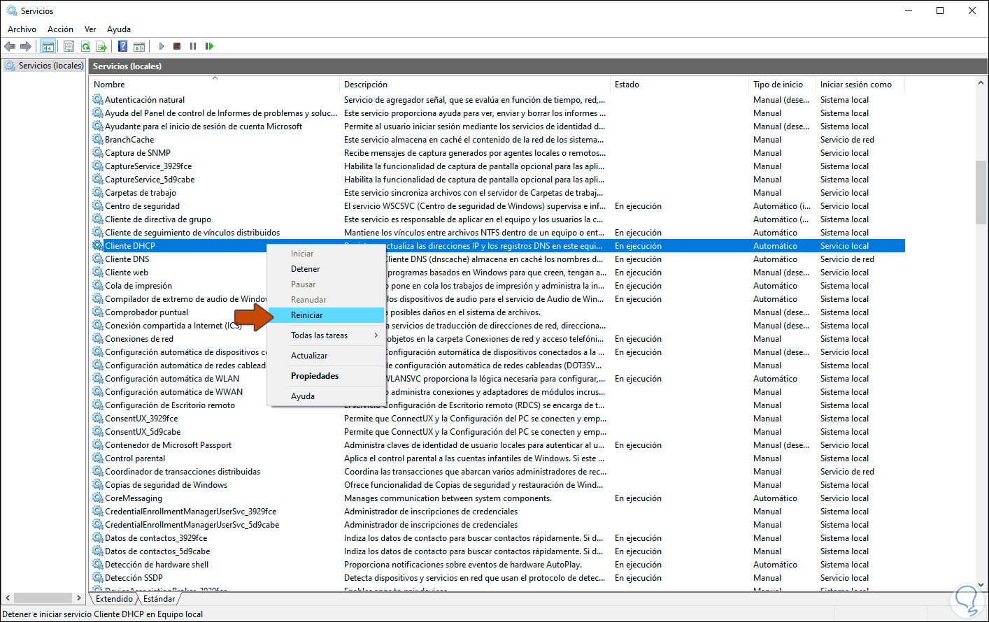 Pulsamos en Aplicar y Aceptar para guardar los cambios y finalmente damos clic derecho de nuevo sobre el servicio y seleccionamos “Reiniciar”: