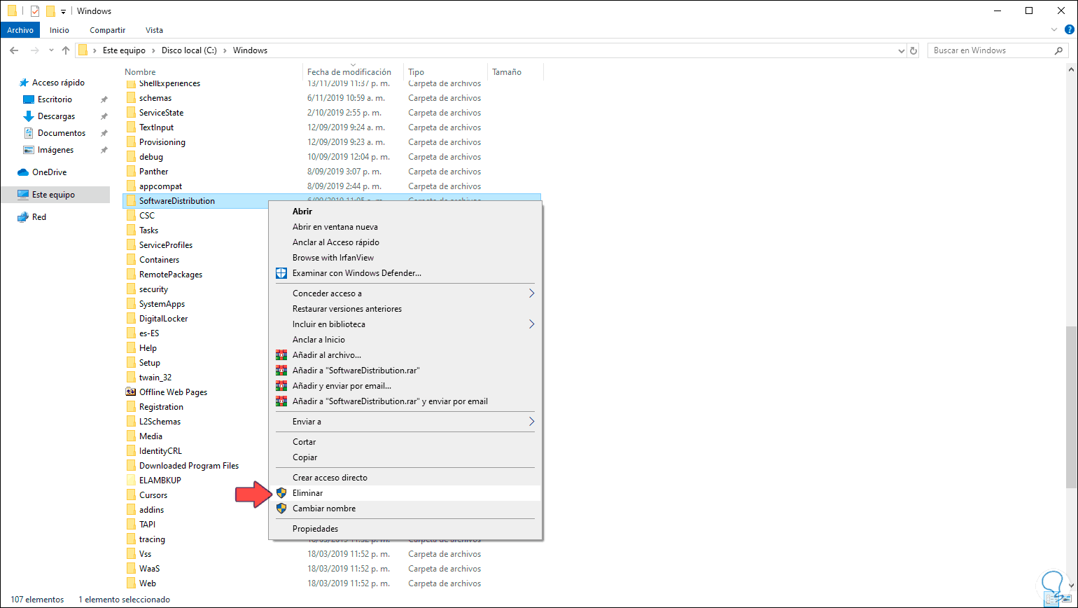 Una vez el servicio este detenido, iremos a la siguiente ruta en el Explorador de archivos, C:\Windows, y allí procedemos a borrar la carpeta Software Distribution: