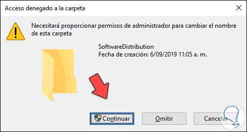 Después de esto iremos a C:\Windows y renombramos la carpeta SoftwareDistribution como SoftwareDistribution.old y veremos el siguiente mensaje: