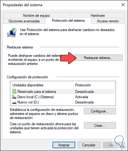 7. Solucionar error de Windows Update usando punto de restauración en Windows 10