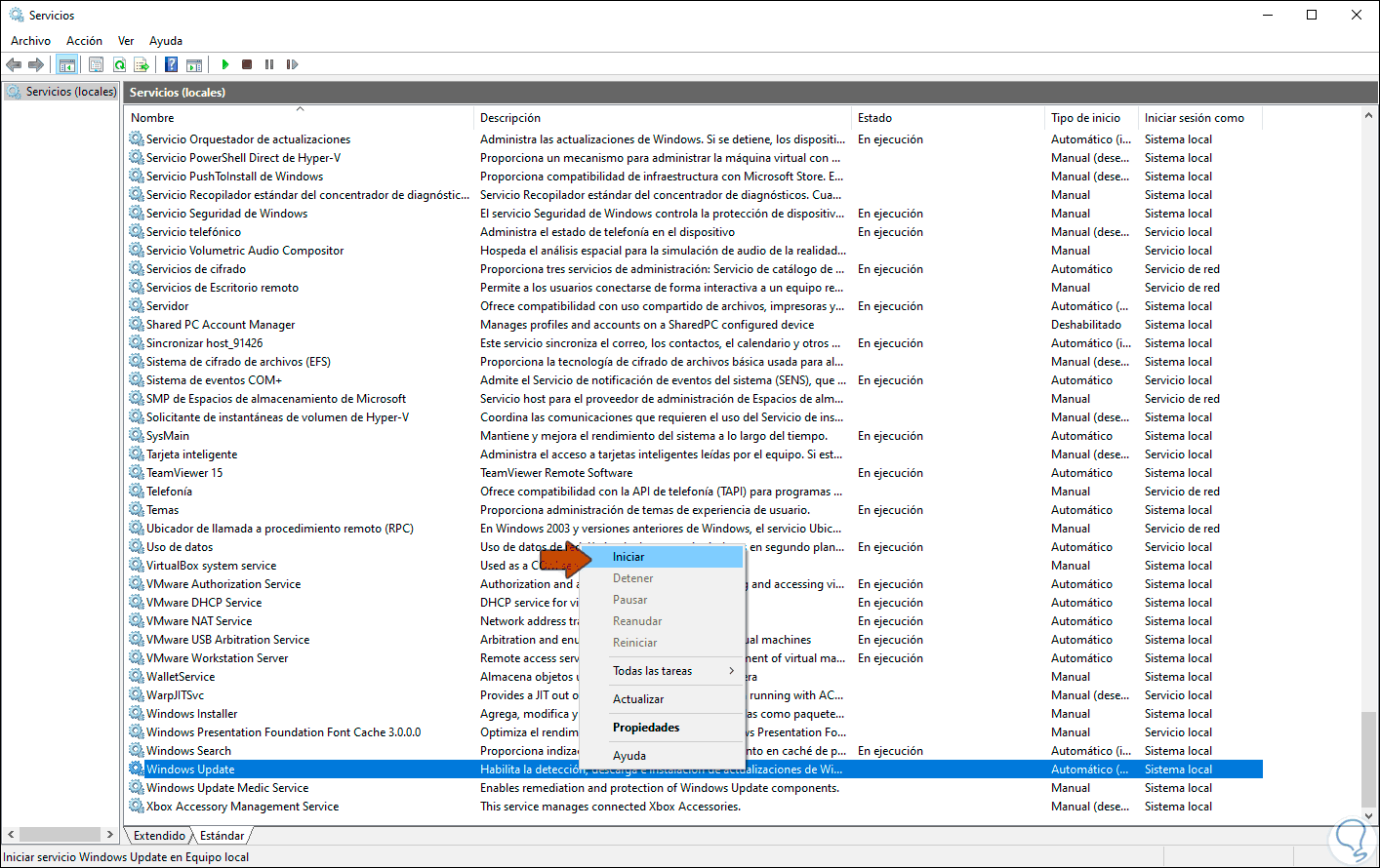 Una vez eliminemos esta carpeta, vamos de nuevo a los servicios de Windows, damos clic derecho sobre el servicio Windows Update y seleccionamos Iniciar para que sea ejecutado de nuevo. Después de esto, reiniciamos el equipo para que de forma automática Windows 10 se encargue de crear la carpeta Software Distribution.