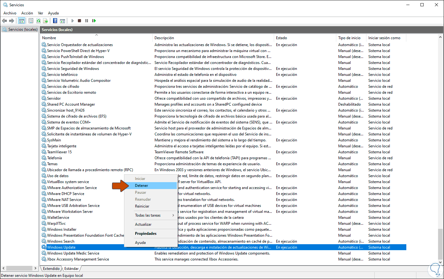 Pulsamos Enter y en la ventana desplegada ubicaremos el servicio llamado “Windows Update”, damos clic derecho sobre él y seleccionamos la opción Detener: