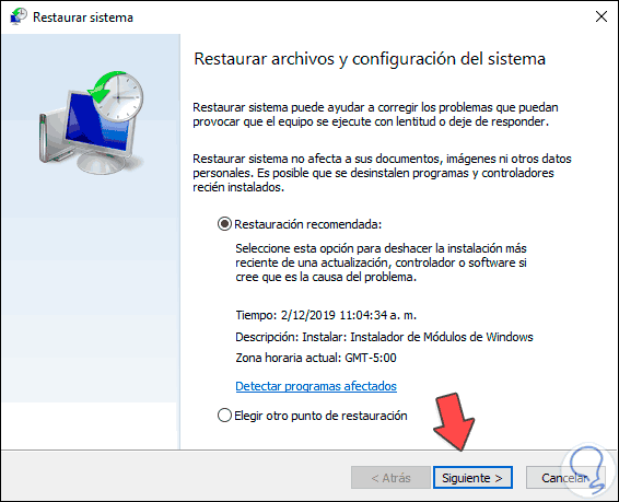 Allí damos clic en el botón “Restaurar sistema” y automáticamente Windows 10 nos dará un punto de sugerencia o bien podemos seleccionar otro punto si así consideramos necesario: