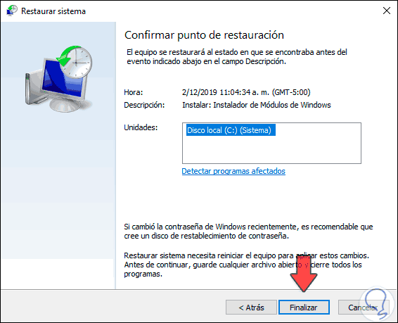Damos clic en Siguiente para confirmar el punto de restauración. Damos clic en “Finalizar” para iniciar este proceso y así tener el equipo en una fecha donde sabíamos que todo funcionaba a la perfección.