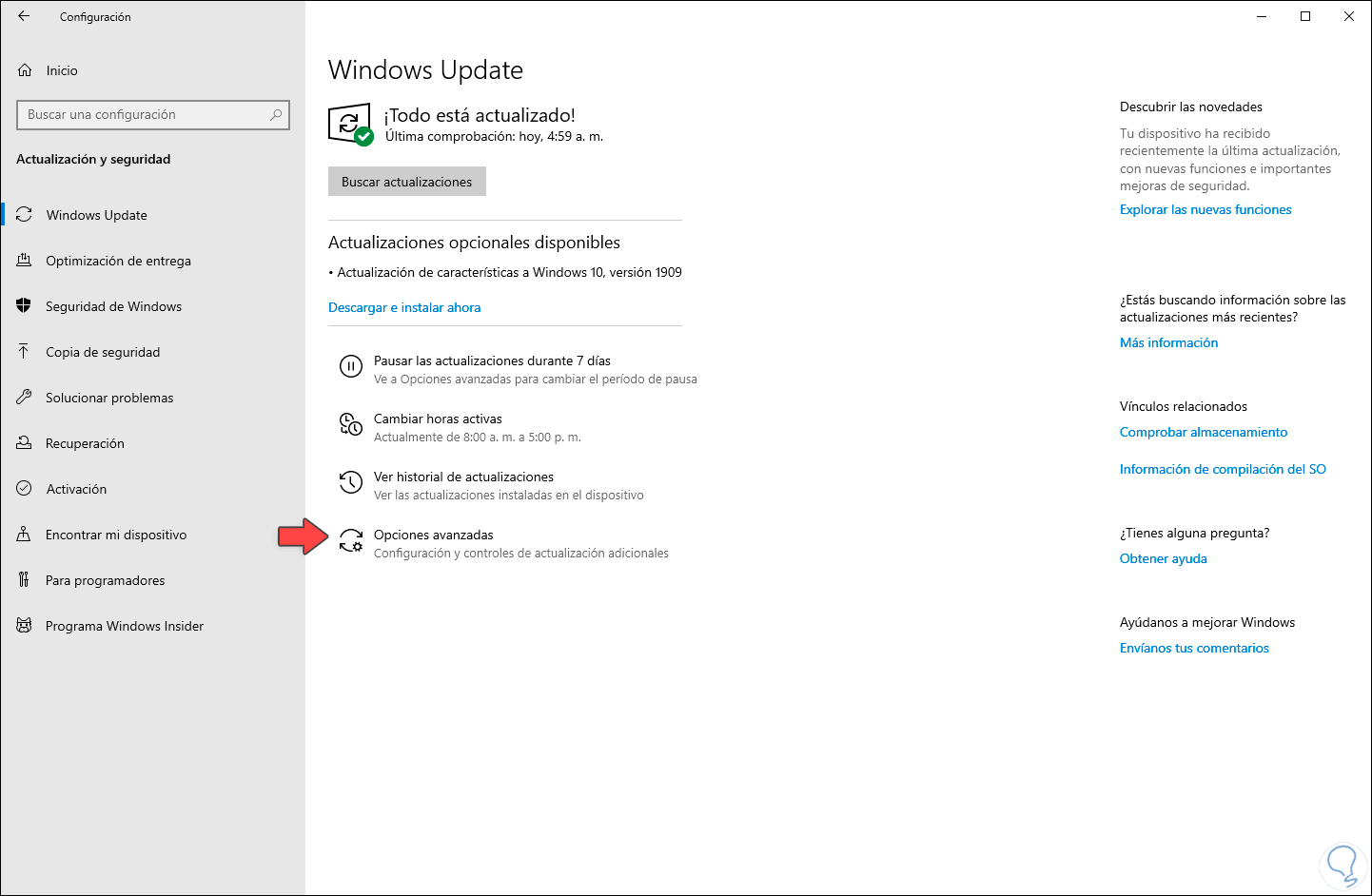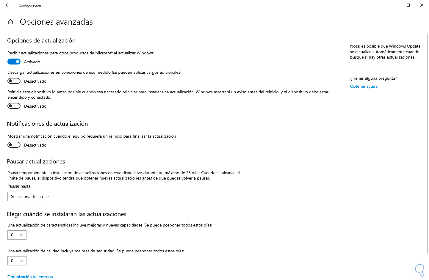 Allí tenemos la oportunidad de pausar las actualizaciones del sistema hasta por 7 días, o bien podemos dar clic sobre “Opciones avanzadas” para definir más métodos de administración de las actualizaciones en el sistema: