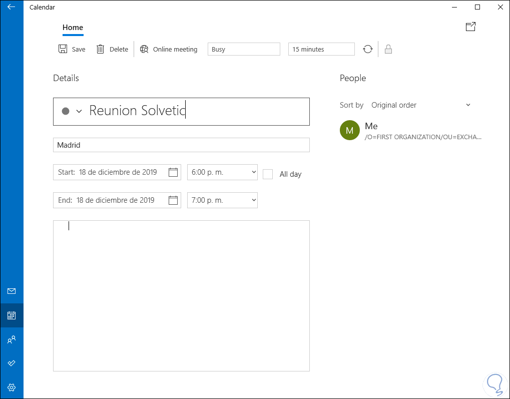 Si damos clic sobre ese día se abrirá la aplicación Calendario con una vista mucho más completa del evento: