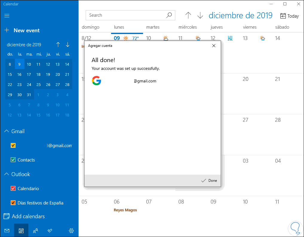Una vez añadida la cuenta veremos la confirmación de esta acción. Damos clic en Done para finalizar.