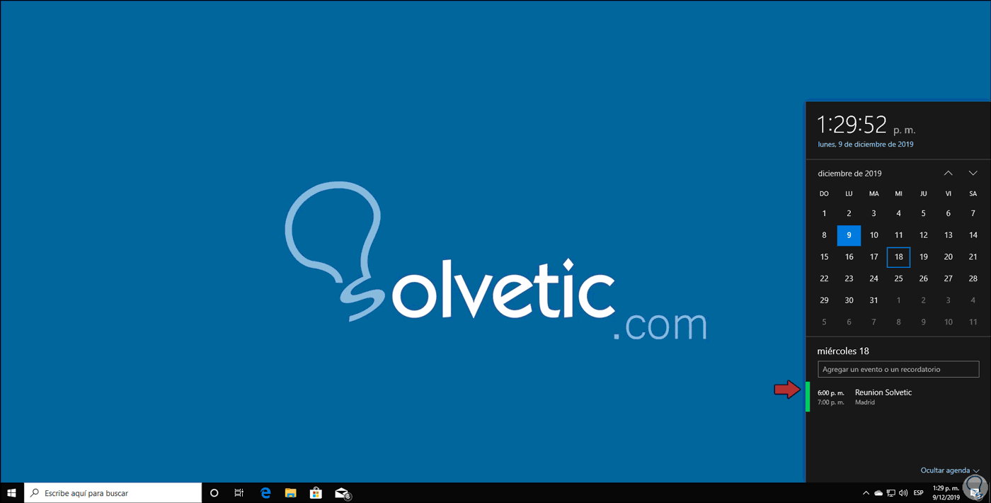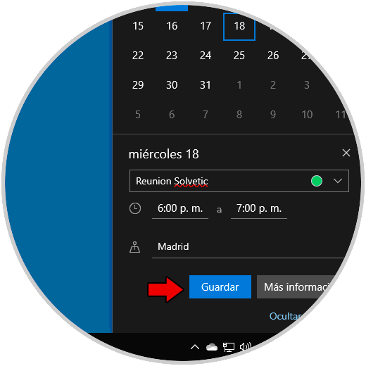 Para ver un evento de calendario en Windows 10 basta con acceder el panel dando clic sobre el reloj en la barra de tareas.