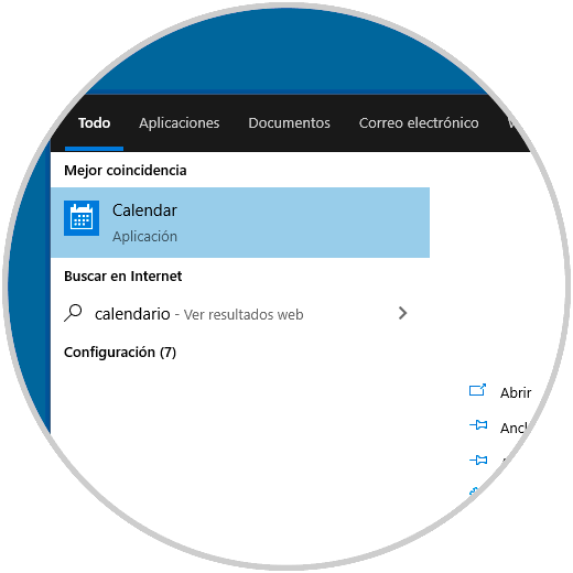 Para ello debe ser usada directamente la aplicación Calendario a la cual accedemos desde el buscador del menú Inicio: