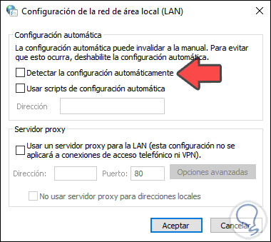 Ahora debes pulsar el botón “Configuración de LAN” y a continuación desactivar “Detectar la configuración automáticamente”. Pulsamos en Aceptar para completar el proceso.