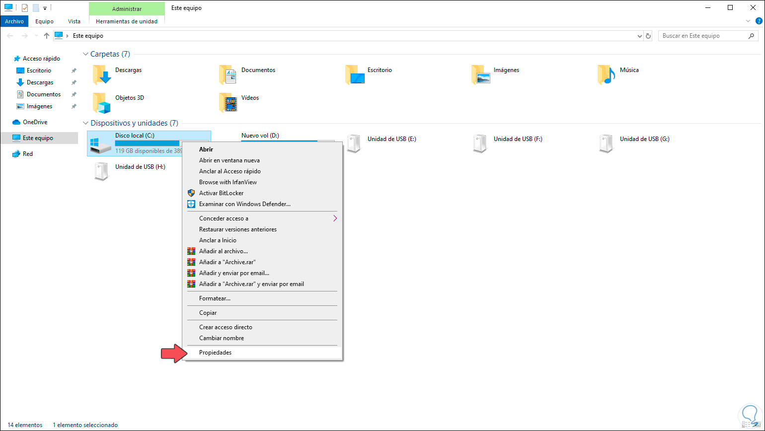 Para comprobar las unidades debemos ir al Explorador de archivos de Windows y dar clic derecho sobre la unidad donde Steam está instalado y seleccionamos la opción Propiedades: